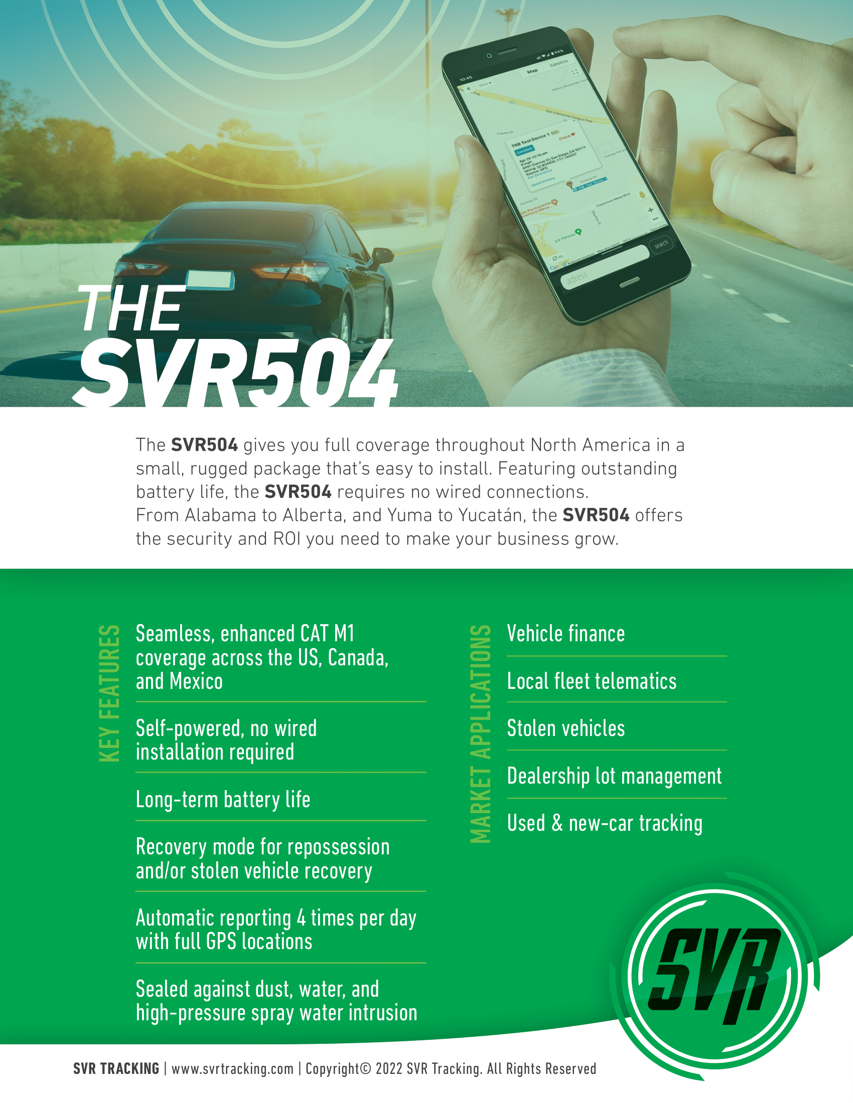 The SVR504 gives you full coverage throughout North America in a small, rugged package that’s easy to install. Featuring outstanding battery life, the SVR504 requires no wired connections. From Alabama to Alberta, and Yuma to Yucatán, the SVR504 offers the security and ROI you need to make your business grow.